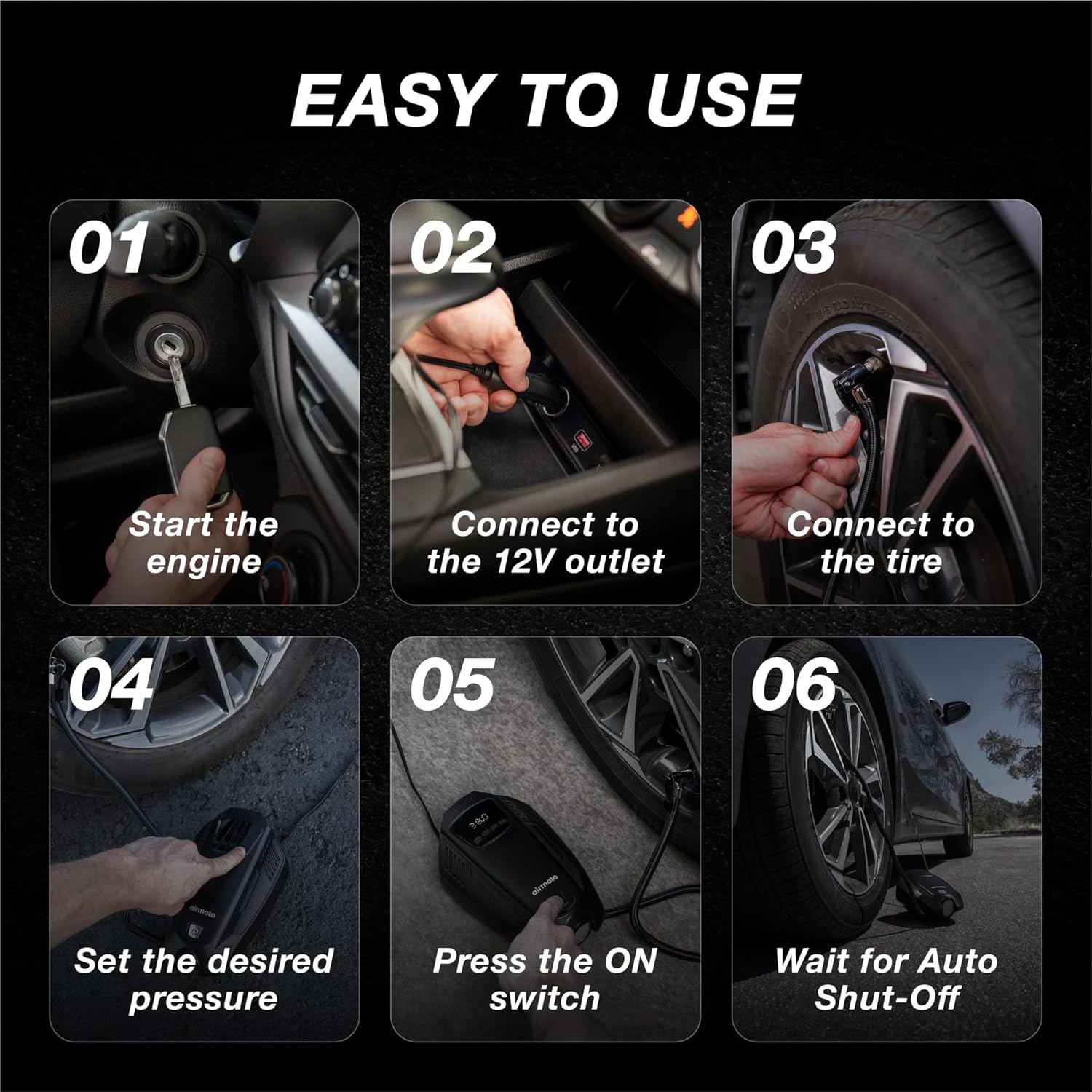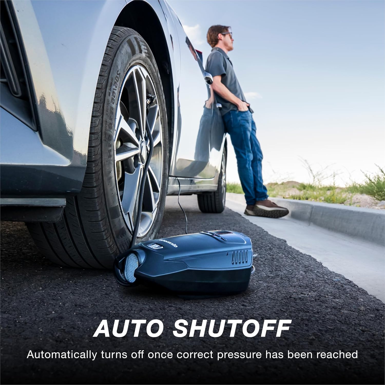 - SMART PRESSURE SETTING: Skip the guesswork with Airmoto MX100's intuitive interface. Choose your desired pressure units and let the smart air compressor for car shut off automatically upon reaching the pre-set pressure. It's the ultimate in car accessories for smart and efficient tire care.